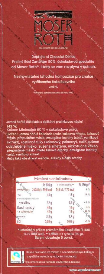 Dopřejte si Chocolat Délice Praliné Edel Zartbitter 50%, čokoládovou specialitu od Moser Roth®, která se vám rozplývá v ústech.