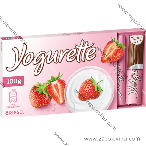 Plněná mléčná čokoláda s odstředěným mléčným jogurtem a jahodovým krémem.