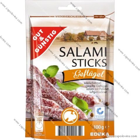 - Lze uchovat bez chlazení seznam složekSložení: krůtí maso, palmový tuk, jodidovaná kuchyňská sůl (kuchyňská sůl, jodičnan draselný), dextróza, koření, výtažky z koření, antioxidanty: askorbát sodný; Konzervační prostředek: Dusitan sodný; Dozrávající kultury, jedlý obal vyrobený z hovězího kolagenu. 100 g drůbežího salámu je vyrobeno z 200 g krůtího masa a 11 g palmového tuku.