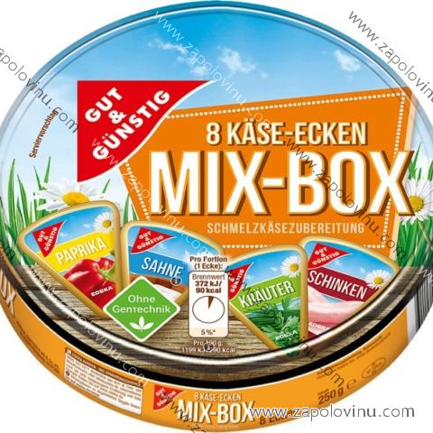 Složení: smetana: 36% SÝR, sladká smetana, MASLO, sladké a smetanové mléko, roztavená sůl: citráty sodné, polyfosfáty, difosfáty, fosforečnany sodné; SKIMMEDOVANÝ MLÉKO, stolní sůl, okyselující látka: paprika s kyselinou citrónovou s 3% paprikou a 1% okurky: 36% SÝR, PŠENICE, MOUKA, PRÁŠEK S MASKEM, příprava paprikové okurky (paprika, okurka, ocet, maltodextrin), roztavená sůl: citráty sodné, polyfosforečnany, difosforečnany, fosforečnany sodné, fosforečnany sodné, fosforečnany sodné; SKIMMED-MILK POWDER, stolní sůl, okyselující činidlo: šunka s kyselinou citrónovou s 3,6% šunkou: 35% SÝR, sladká smetana, máslo, šunka (šunka, vepřové maso, voda, sůl, dextróza, antioxidant: askorbát sodný, stabilizátor: citrát sodný, zahušťovadlo: karagenan, konzervační prostředek: dusitan sodný) ], Voda, maltodextrin, škrob, stolní sůl, uzená dextróza [dextróza, Kouř], prášek ze sladkého pudinku, roztavená sůl: citráty sodné, polyfosfáty, difosfáty, fosforečnany sodné; PRÁŠEK S MASKEM, sůl, kyselina citrónová Byliny: 36% SÝR, sladká smetana, máslo, sladký pudink, příprava s přísadami koření (cibule, sůl, maltodextrin, bylinky, česnek), roztavená sůl: citráty sodné, polyfosfáty, difosfáty, fosforečnany sodné; SKIMMED MILK POWDER, stolní sůl, okyselující činidlo: kyselina citrónová.